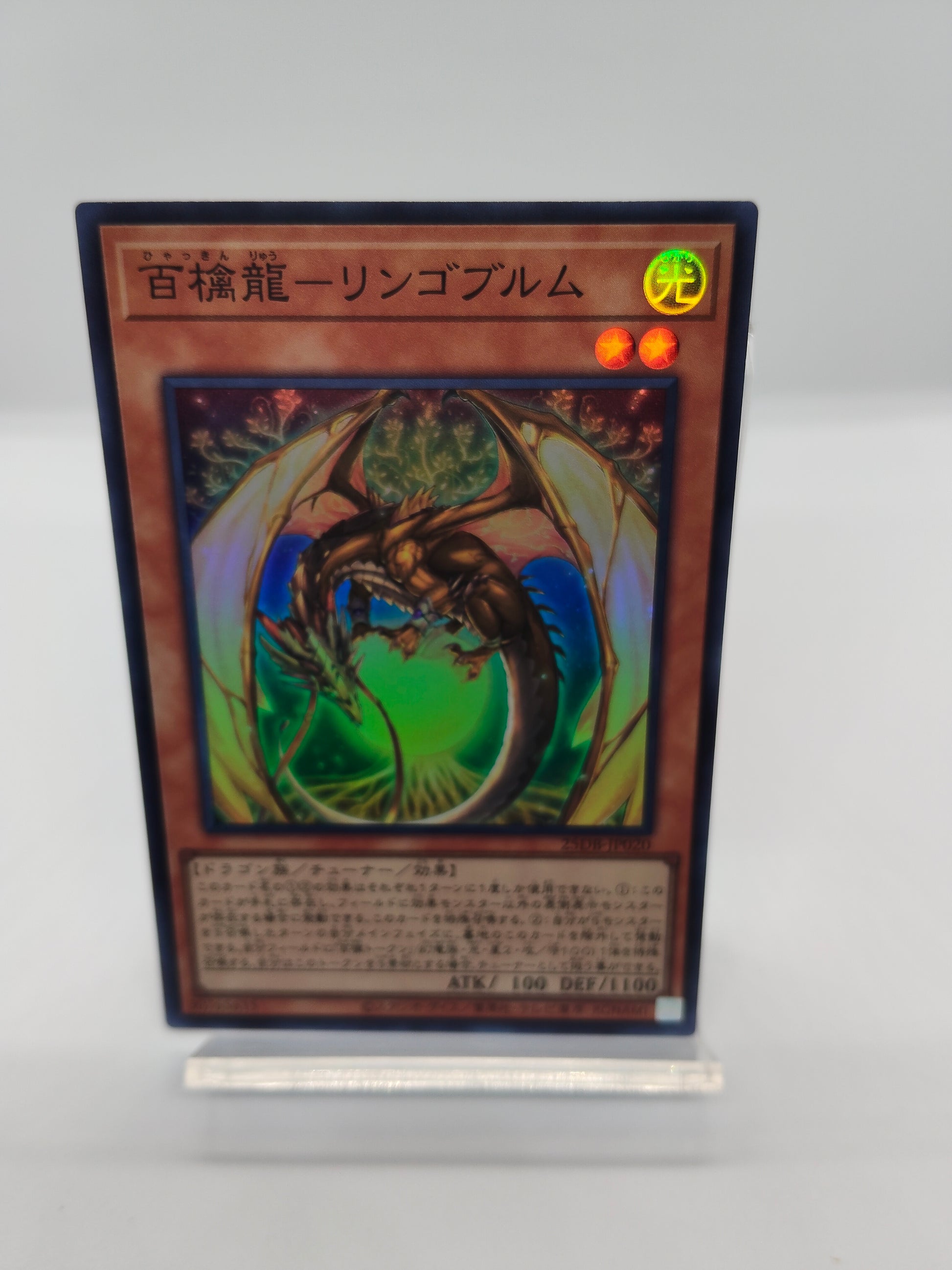 このカード名の(1)(2)の効果はそれぞれ1ターンに1度しか使用できない。 (1):フィールドに効果モンスター以外の表側表示モンスターが存在する場合に発動できる。 このカードを手札から特殊召喚する。 (2):自分がSモンスターをS召喚したターンの自分メインフェイズに、 墓地のこのカードを除外して発動できる。 自分フィールドに「百檎トークン」(幻竜族・光・星2・攻/守100)1体を特殊召喚する。 自分はこのトークンをS素材とする場合、チューナーとして扱う事ができる。ステータス